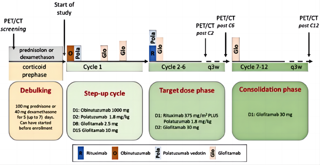在单剂奥妥珠单抗(Gpt,1000 mg)预处理后,在第1/2周期采用格菲妥单抗阶梯剂量递增给药(2.5/10/30 mg)。1周之后,患者开始接受Englumafusp alfa治疗,自第3周期D1起,每3周接受两种药物治疗。整体治疗期限最长持续12个周期。在剂量递增过程中,采用控制药物过量的连续重评估方法(mCRM EWOC)。同时依据Lugano分期标准对治疗反应率进行评估。