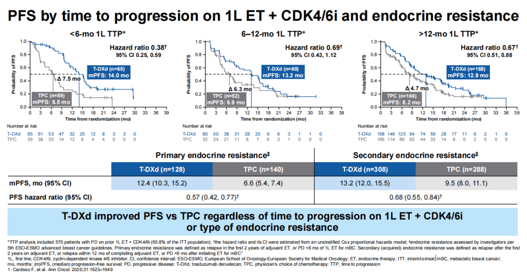 在研究者评估的原发性和继发性内分泌耐药患者中,疗效结局一致。在TTP亚组分析中,接受T-DXd和TPC的患者发生≥3级治疗相关不良事件的发生率与总体安全性人群一致(<6个月:55.4%vs 42.4%;n=124;6~12个月:59.3%vs 40.8%;n=108;>12个月:45.8%vs 42.9%;n=329)。