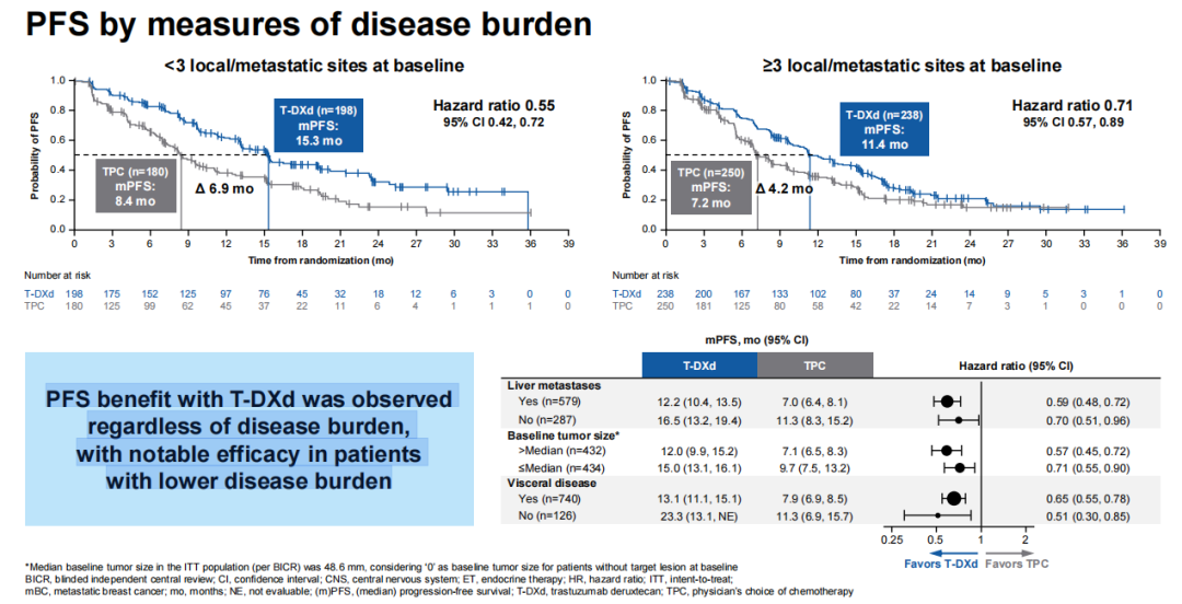 无论患者的疾病负担如何,使用T-DXd均可观察到PFS的获益,在疾病负担较低的患者中疗效显著。