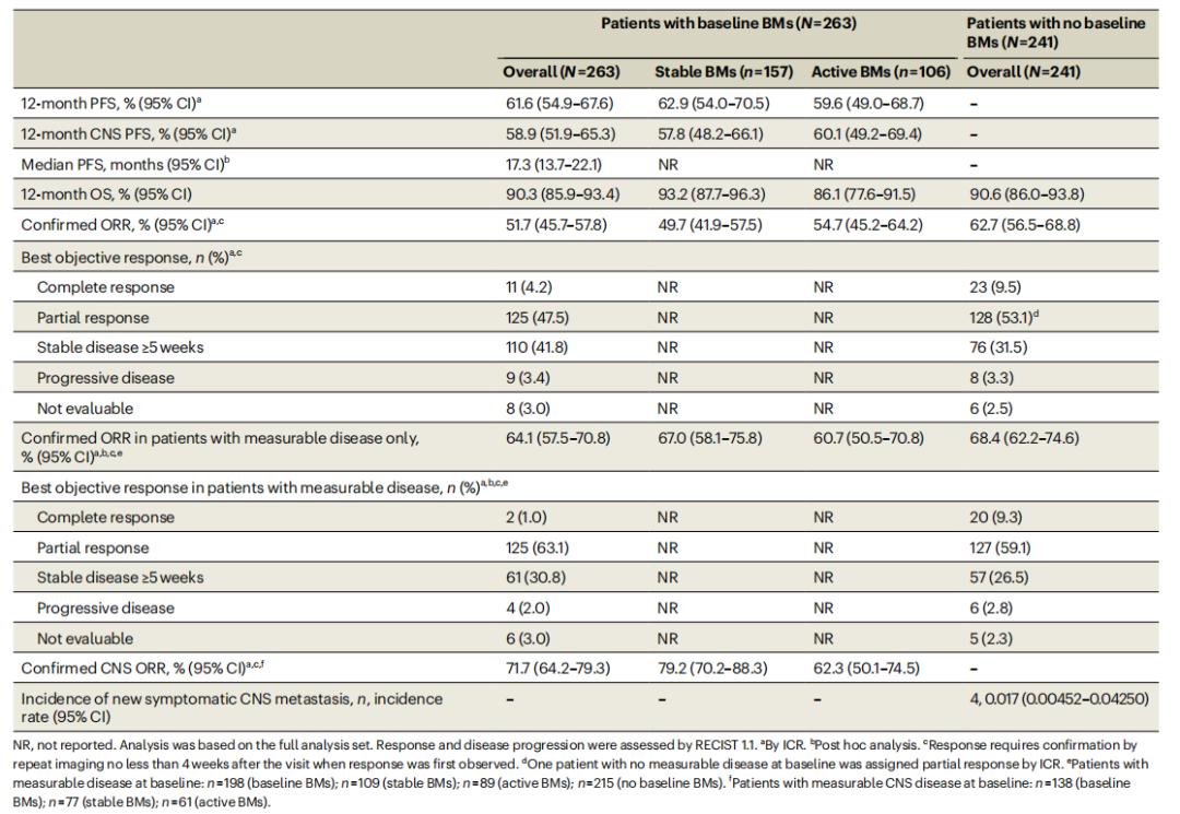 至疾病进展时间(从首次给药至记录到疾病进展的时间)、至第二次疾病进展时间(PFS2)、总生存期(OS)数据不成熟。12个月时PFS2为83.1%(95%CI:77.5-87.4),12个月OS为90.3%(95%CI:85.9-93.4)(图2b和表1)。在基线脑转移全分析集中,经证实的ORR为51.7%(95%CI:45.7-57.8)(表1)。稳定性和活动性脑转移患者的ORR分别为49.7%(95%CI:41.9-57.5)和54.7%(95%CI:45.2-64.2)(表1)。靶病变大小的最佳变化百分比如图3a所示。