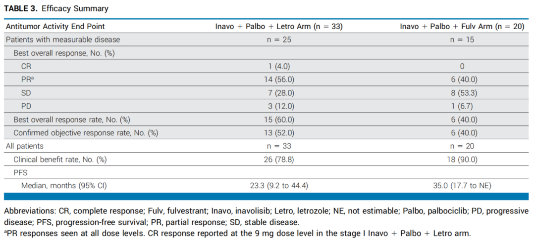 尽管本研究中的队列规模较小,但临床前联合用药疗效数据的可转化性得到了有前景且持久的抗肿瘤活性数据的支持。在来曲唑组,中位PFS为23.3个月;氟维司群组,中位PFS为35.0个月。尽管数据有限,但伊那利塞、哌柏西利和ET的联合用药在配对的肿瘤组织样本中降低了PI3K/AKT通路生物标志物表达和增殖,这既证实了伊那利塞的作用机制,也证实了这一联合用药的抗肿瘤效果。