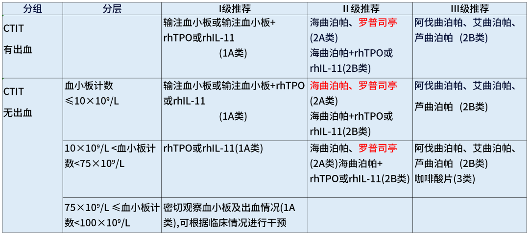 2. CTIT无出血且血小板计数<75×109/L患者,罗普司亭提升至II级推荐(2A类)。