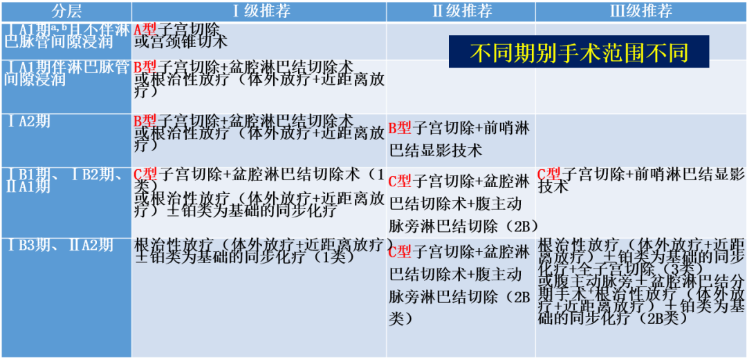 对于无保留生育功能要求的早期宫颈癌患者,根据疾病分期推荐A型、B型或C型子宫切除术,不同期别患者的手术范围不同。针对早期宫颈癌的手术治疗,近期两项大型前瞻性研究提示缩小手术范围可达到与传统根治性手术相当的疗效,同时降低手术相关并发症并改善生活质量,但需要术前精准识别低复发风险患者。在采用这种手术策略的研究中,尽管术前已对患者进行综合评估,研究结果显示部分患者术后病理结果与术前评估不符。CSCO指南去年未对此类手术策略作出直接推荐,今年是否将其纳入推荐,尚需进一步研讨。