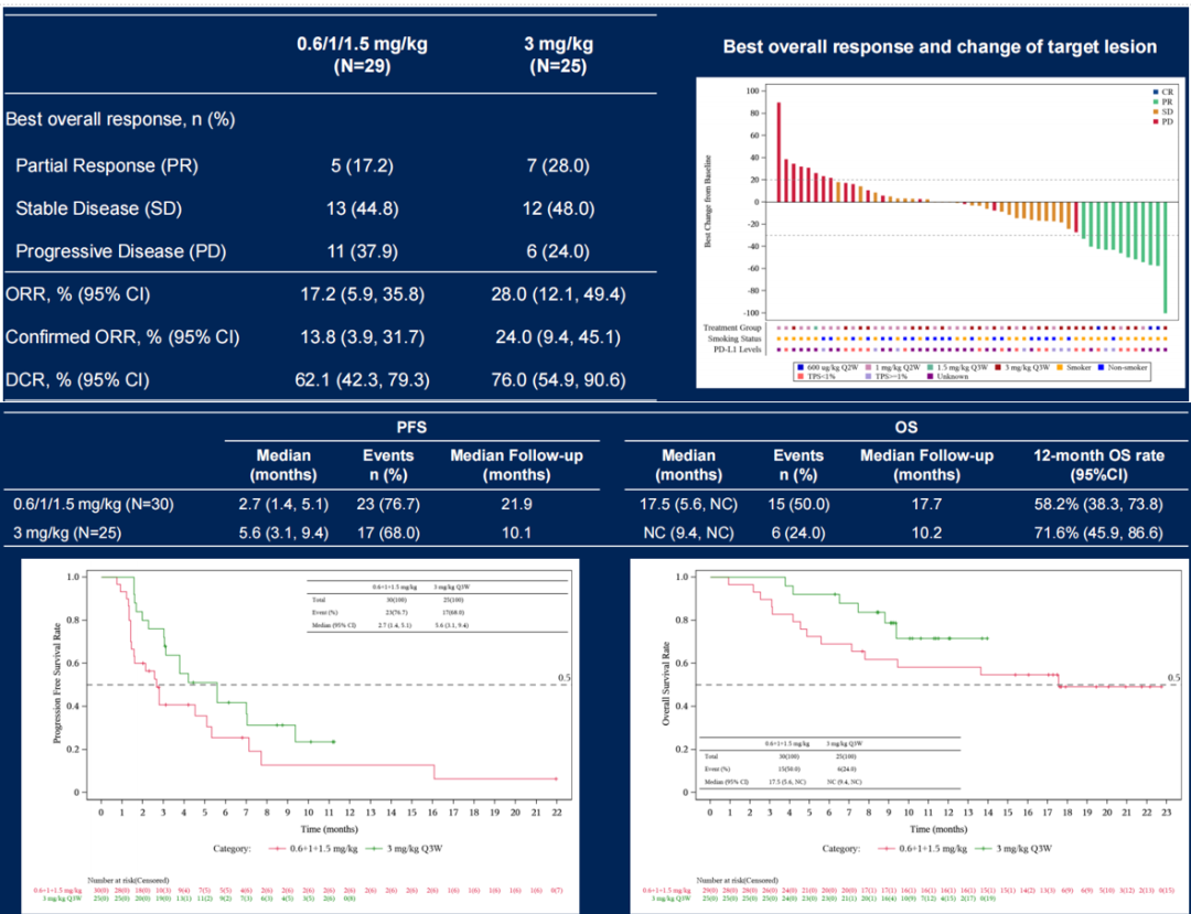 亚组分析显示,在吸烟者中(腺癌队列),3 mg/kg剂量组观察到的获益更显著,确认ORR为33.3%。值得注意的是,无论PD-L1状态如何,所有患者均观察到令人鼓舞的缓解。其中在3 mg/kg剂量组中,PD-L1 TPS<1%的鳞癌和腺癌患者的ORR分别达到46.2%和20.0%。