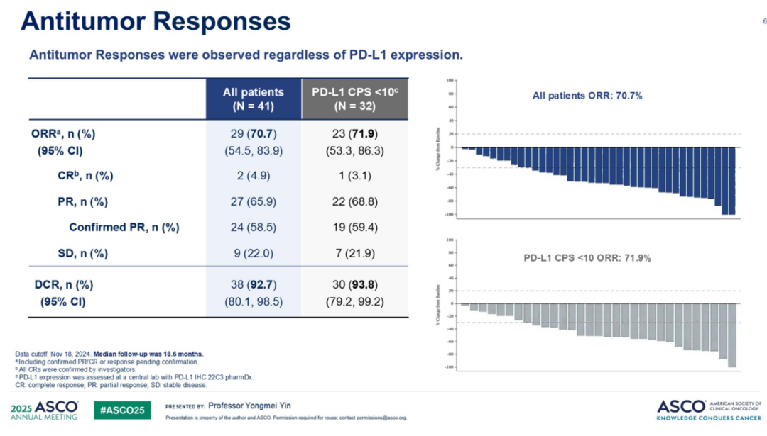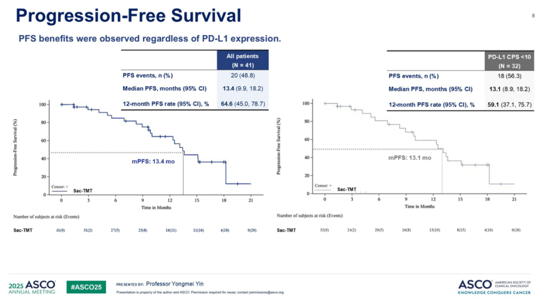另一个重要研究是江苏省人民医院殷咏梅教授在ASCO大会口头报告的TROP2 ADC芦康沙妥珠单抗作为不可切除局部晚期/转移性三阴性乳腺癌一线治疗的单臂、II期OptiTROP-Breast05研究。该研究入组41例患者,中位随访18.6个月,结果显示总体ORR为70.7%,DCR为92.7%,中位PFS为13.4个月。特别值得注意的是,在PD-L1 CPS<10的患者中,ORR仍达71.9%,mPFS为13.1个月。安全性方面未观察到治疗相关死亡、神经毒性或间质性肺病。