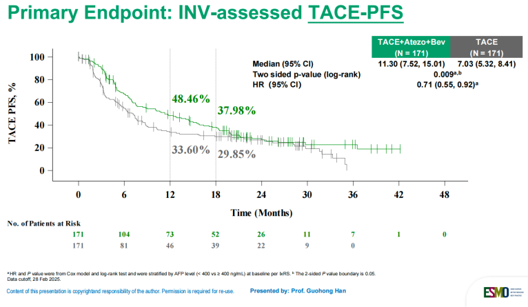 编者按:2025年7月3日,在2025年欧洲肿瘤内科学会胃肠道癌症大会(ESMO GI 2025)上,III期临床研究TALENTACE作为突破性进展(Late-Breaking Abstract,LBA2)公布关键结果,受到全球肿瘤学界高度关注。该研究评估了阿替利珠单抗+贝伐珠单抗联合按需经动脉化疗栓塞术(TACE)在未接受过全身系统治疗的不可切除肝细胞癌患者中的疗效和安全性。研究结果显示,主要终点TACE无进展生存期(TACE-PFS)取得了统计学和临床意义上的显著改善,中期分析时总生存期(OS)尚不成熟。同时,由RECIST v1.1标准评估的无进展生存期(PFS)也观察到了有临床意义的改善。这一突破性研究为肝癌治疗领域带来了新的希望,标志着局部肿瘤控制与系统分子干预的联合治疗模式取得重大进展。
