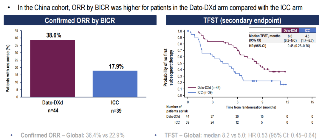 Dato-DXd组较ICC组ORR提升近1倍(38.6%vs17.9%),至首次后续治疗时间(TFST)也显著延长(8.6个月vs 4.5个月,HR 0.45,95%CI:0.26-0.76)。