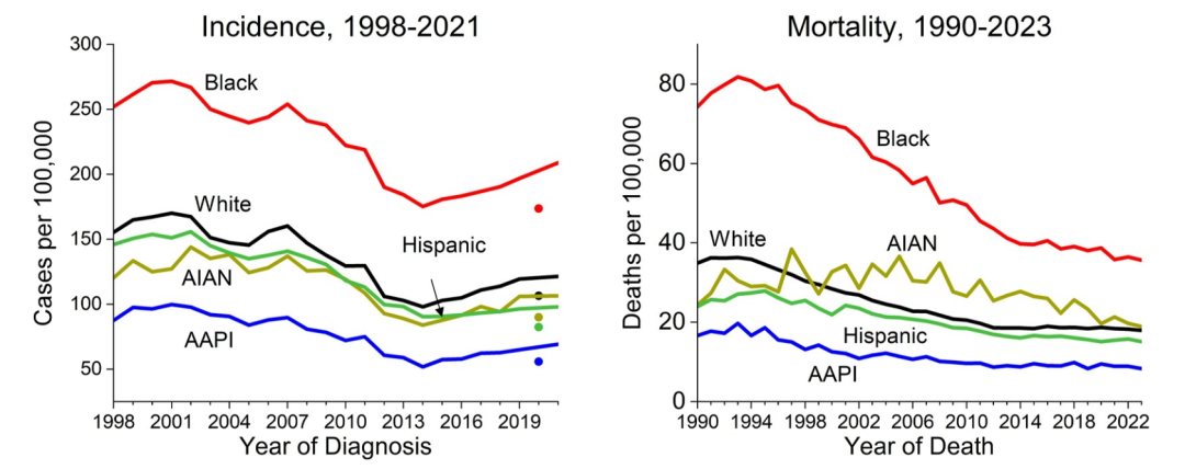前列腺癌死亡率在1993年之前持续上升,之后到2023年下降了50%以上,部分原因是通过PSA筛查实现了更早发现以及治疗的改进。然而,从1993年到2012年每年3.5%的快速下降,在2012年至2023年期间已减缓至每年0.6%,并且在55-69岁男性中死亡率趋于稳定。自2001年以来,黑人男性前列腺癌死亡率的下降幅度(每年2.9%)大于白人男性(每年1.9%),而白人男性的死亡率自2012年以来每年仅下降0.2%。因此,黑人男性与白人男性在前列腺癌死亡率上的差距已经从2001年峰值时黑人男性高出2.5倍,缩小到2023年高出两倍,这一差距仍然大于2021年发病率72%的差异。