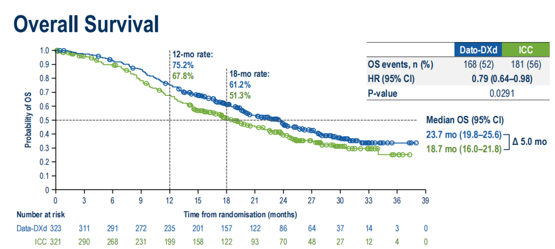 Dato-DXd组中位OS为23.7个月(95%CI:19.8-25.6),ICC组中位OS为18.7个月(95%CI:16.0-21.8)。Dato-DXd相较于化疗使患者中位OS延长5.0个月,降低21%的死亡风险,HR 0.79(95%CI:0.64-0.98);P=0.0291。