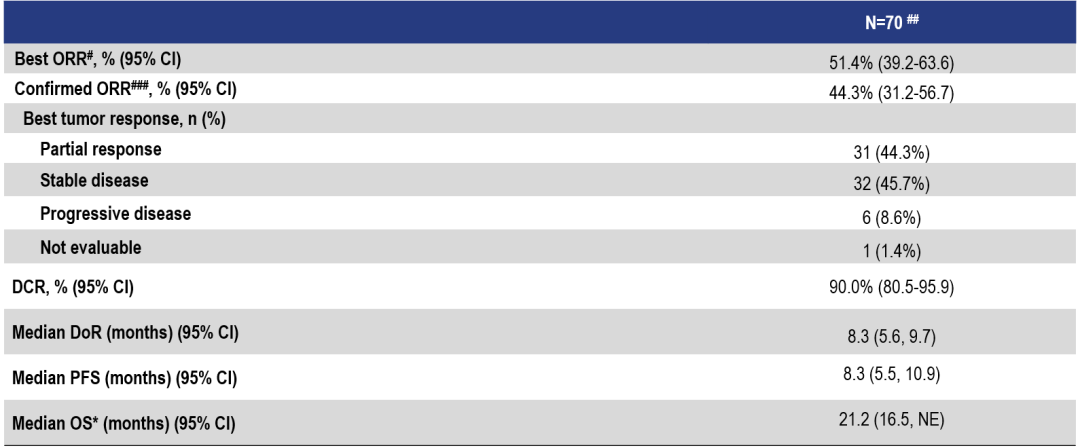 该研究患者疾病控制率为90.0%,中位缓解持续时间达8.3个月,最长缓解持续时间超过24个月;中位PFS为8.3个月,中位OS近2年(21.2个月)[6];这对于经治患者而言,意味着生存期的明显延长,表明了伏美替尼的长效控瘤潜力。