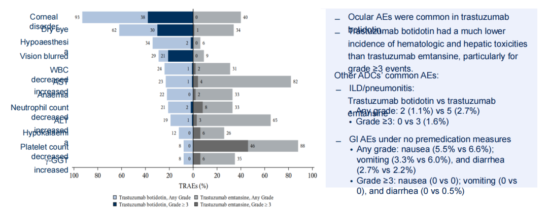 相较之下,A166在安全性方面展现出明显优势。该药物血液学及肝脏毒性(尤其是≥3级)发生率明显低于T-DM1,且未观察到≥3级胃肠道毒性,也无需预防性止吐处理,且未见≥3级间质性肺病(ILD)发生,为临床二线治疗提供了新的、更为安全的选择。
