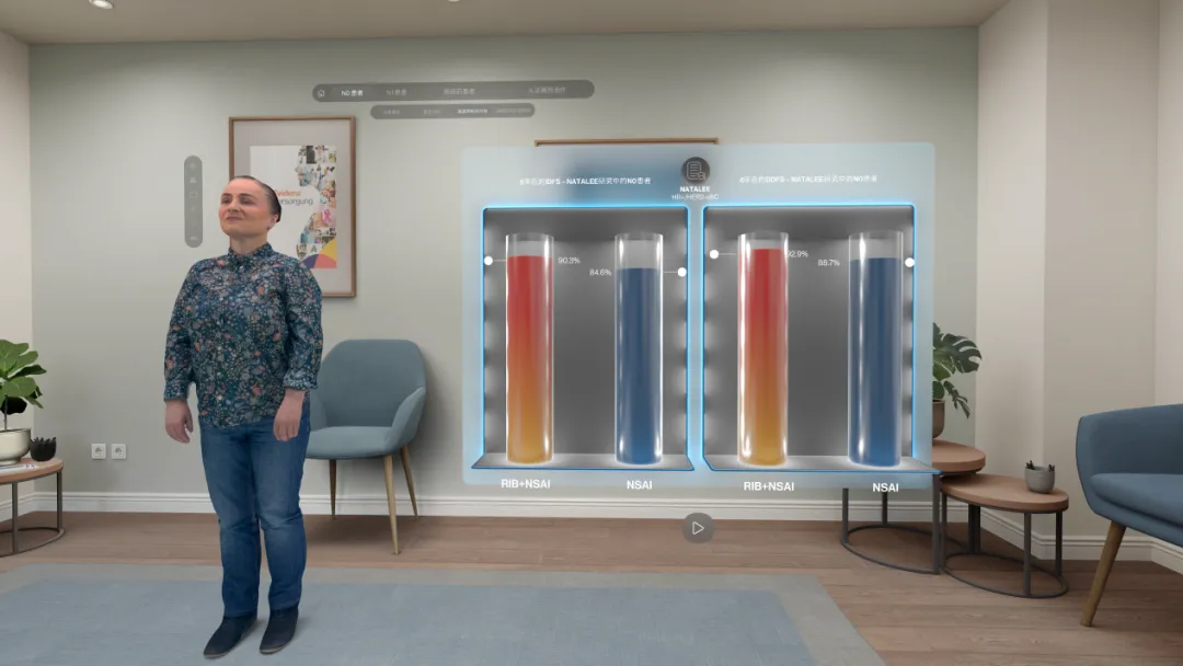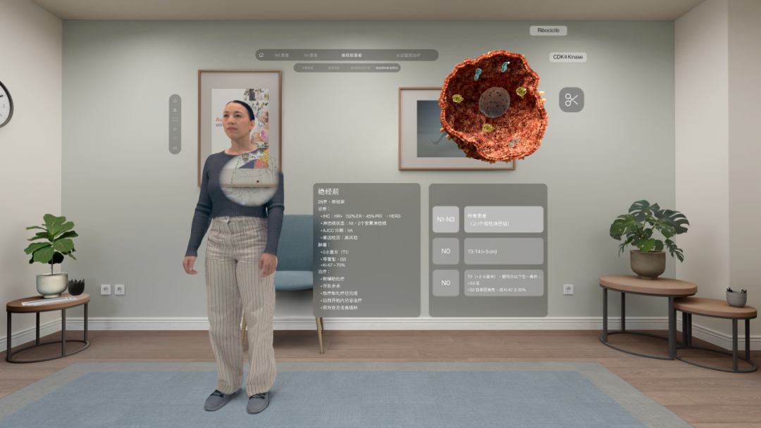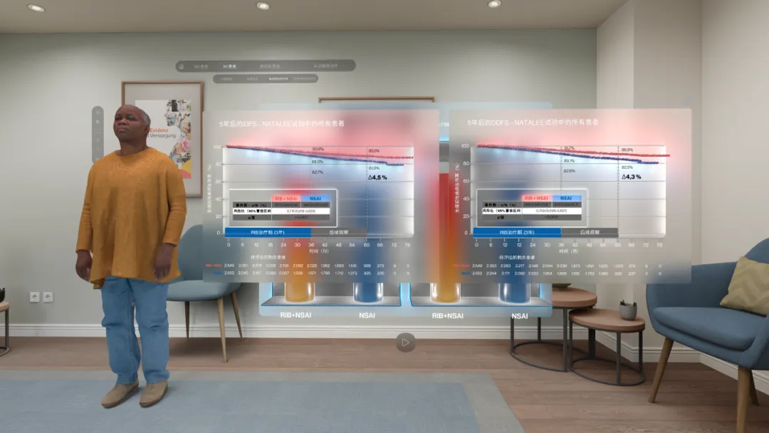 传统医学信息依赖二维图像与数值,而VR系统通过高精度构建肿瘤微环境,实现真正的三维可视化。医生可亲手抓取、旋转并剖析动态肿瘤模型,甚至在分子层面进行“精准切割”,直观观察瑞波西利等药物的作用机制。系统同步叠加复发风险与生存数据,将循证证据转化为可感知的视觉语言。