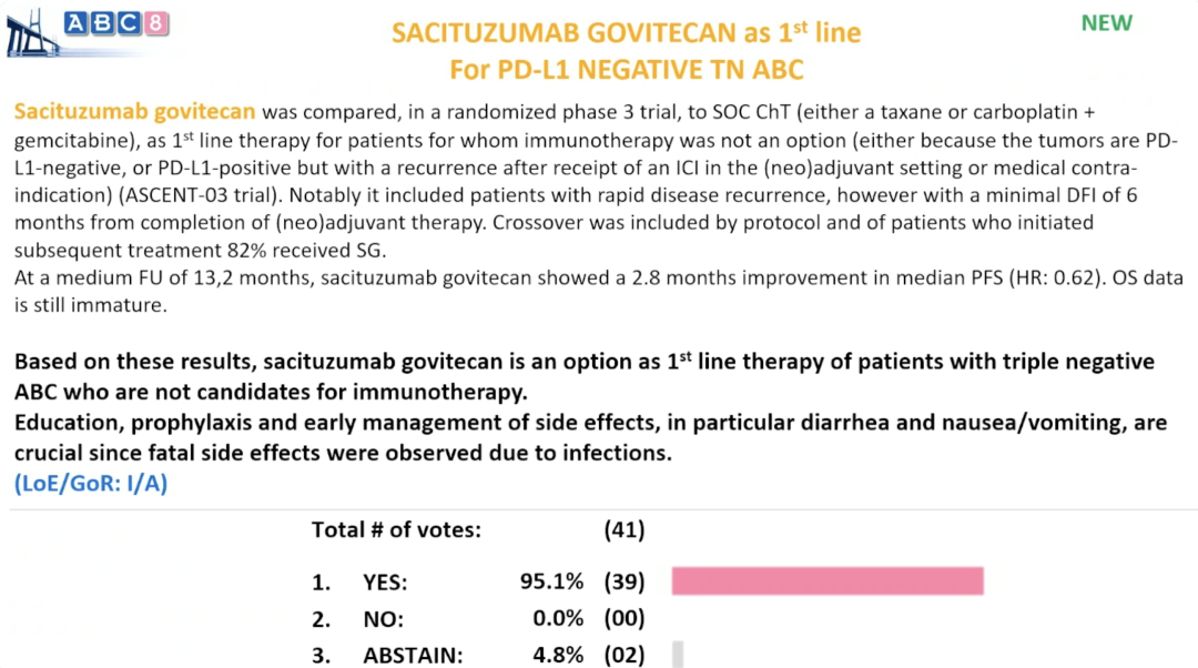 △ABC8国际指南专家投票结果:基于ASCENT-04研究结果,对于PD-L1阳性的晚期TNBC患者,SG联合帕博利珠单抗可作为一线治疗选择(证据水平/推荐级别:I/B)