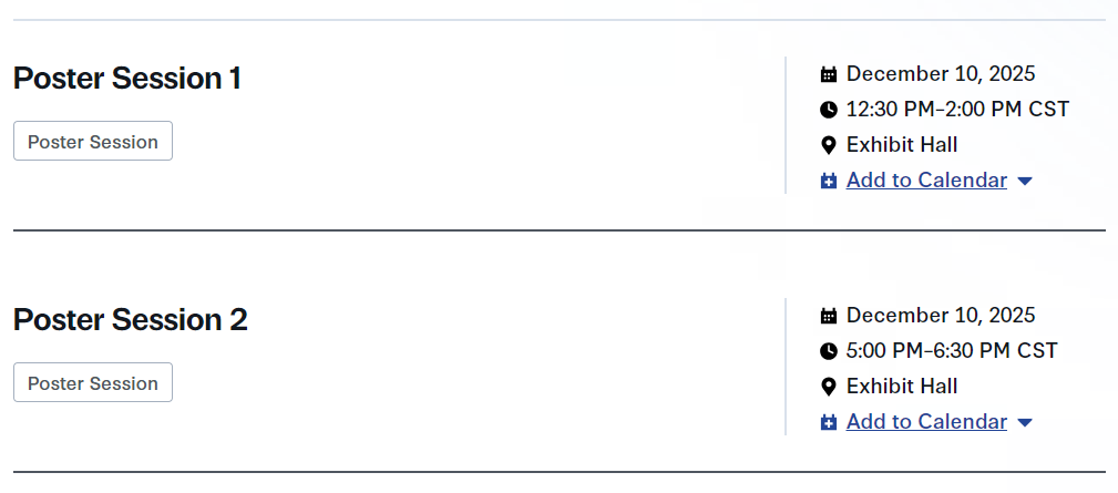 两场海报展示:1、Poster Session 1;2、Poster Session 2。