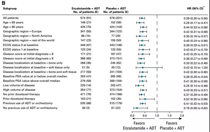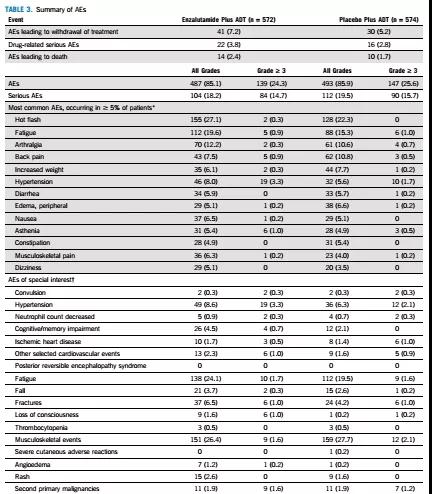 该研究平均治疗时间实验组为12.8个月,对照组为11.6个月。对于安全性来说,实验组与对照组相比,不良反应的发生率大致相当,3级以上AE的发生率两组大致相当(24.3%V.S25.6%)特别是SAE发生率大致相当(14.7%V.S15.7%)。其他3-4级不良反应的发生率均未见明显统计学差异。因此,ADT联合恩杂鲁胺相比安慰剂对照组具有良好的耐受性及安全性。