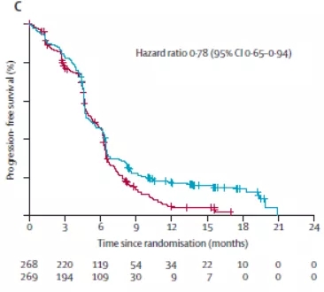 患者需接受连续治疗直至疾病进展、出现不可耐受的毒性反应或撤销知情同意书。患者进展后,若研究者认为患者可以继续从治疗中获益,则允许继续原方案治疗。本研究不允许交叉。前12周每6周进行一次疗效评估,而后每8周进行一次评估直至疾病进展。研究的主要终点为OS,次要终点包括PFS、ORR、18个月的OS率及6个月和12个月的PFS率。