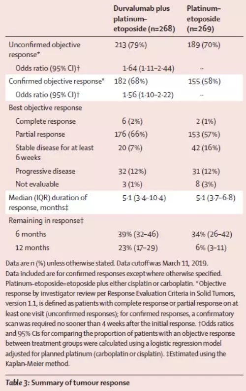 主要分层因素是铂类药物的种类(顺铂或卡铂)。依托泊苷的治疗剂量是80-100 mg/m2(第1-3天给药,每21天一个周期),联合卡铂(AUC=5-6)或顺铂(75-80 mg/m2);Durvalumab的剂量为1500 mg,每3周一次;Tremelimumab的剂量为75 mg/m2,每3周一次。免疫治疗组患者至多接受4周期化疗,然后进行Durvalumab每4周一次的维持治疗,单纯化疗组可给予最多6周期化疗并根据患者实际情况决定是否联合局部放射治疗。