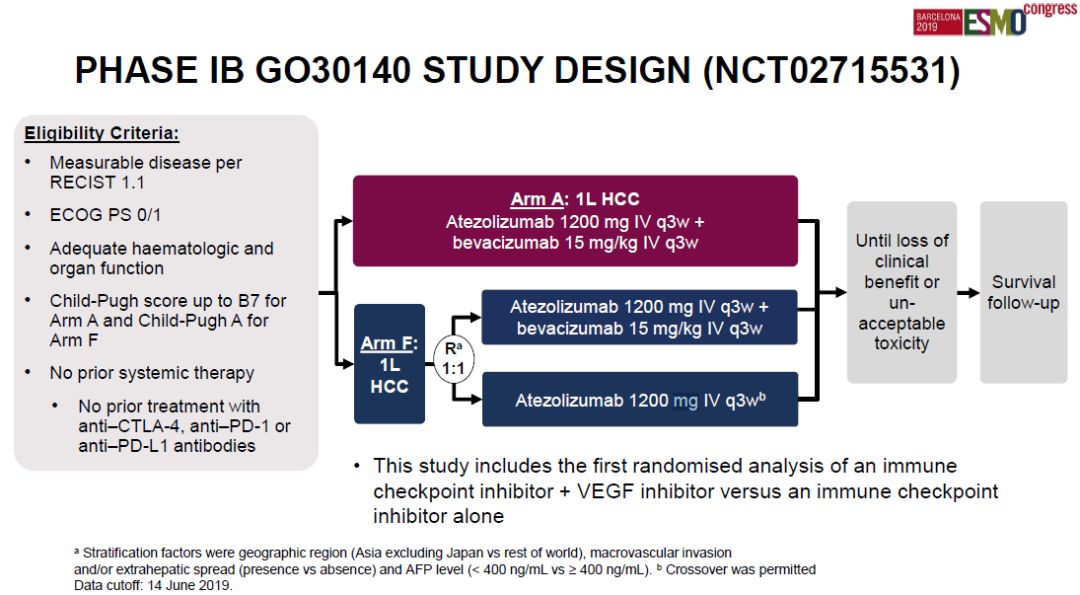背景:不可切除的肝癌患者几乎没有治疗选择。免疫检查点抑制剂联合抗VEGFs正成为新的潜在治疗选择。研究者报告了一项随机试验,评估PD-L1单抗(ATEZO)单药治疗或联合抗VEGFs(BEV)的疗效(队列F),并更新了一项1b期单臂研究中的ATEZO+BEV数据(队列A)。