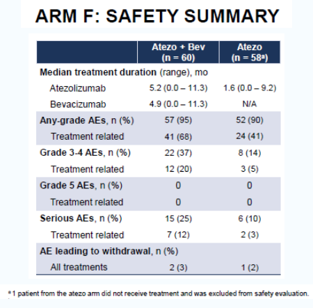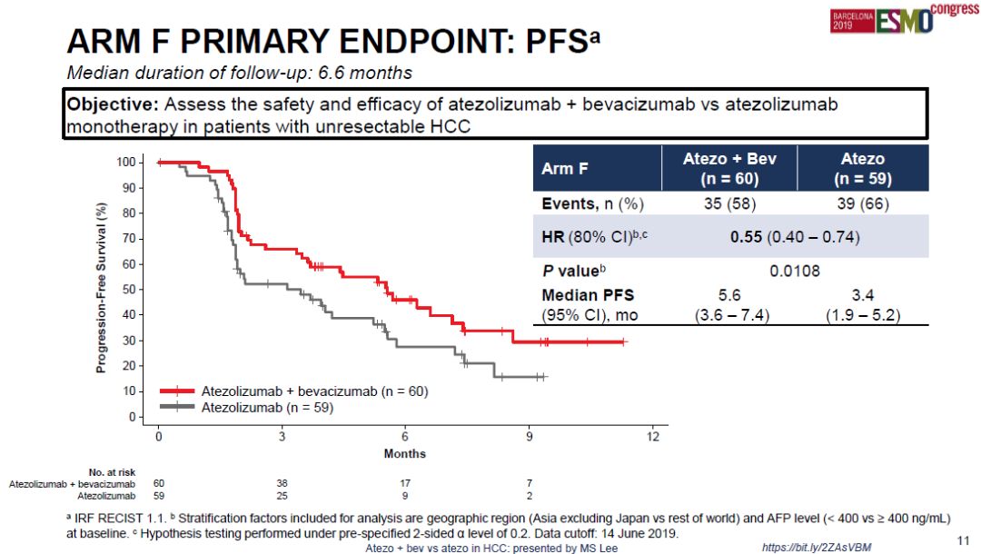 结论:队列F的主要终点结果显示,ATEZO+BEV较ATEZO单药改善患者PFS。随着随访时间延长,队列A的研究结果强调了ATEZO+BEV的临床意义和持久缓解作用。加上可耐受的安全性,这些数据表明ATEZO+BEV有望成为不可切除HCC的一线治疗选择。