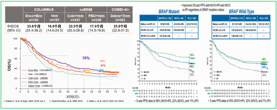 对于晚期黑色素瘤的BRAF-V600突变患者来说,双靶(3项研究结果:Columbus,CoBRIM,COMBI-D/V,左下图)和双免(CM067研究,右下图)都有较高的有效率和长期生存率。因此,对于一线该先使用双免还是双靶?业界一直在争论。