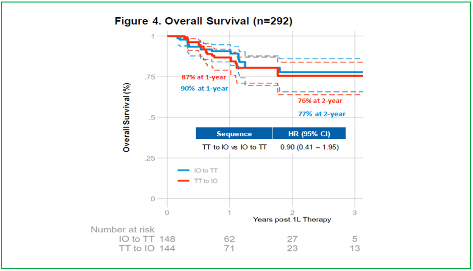 此外,今年ESMO报道了一篇靶向(TT)和免疫(IO)序贯的真实世界数据(摘要号1108P)。该研究收集了296名1L和2L治疗(IO和TT)的BRAF+晚期黑色素瘤患者数据。结果显示两组OS曲线基本重合,TT-IO患者的2年OS为76%,而IO-TT为77%。没有统计学差异。