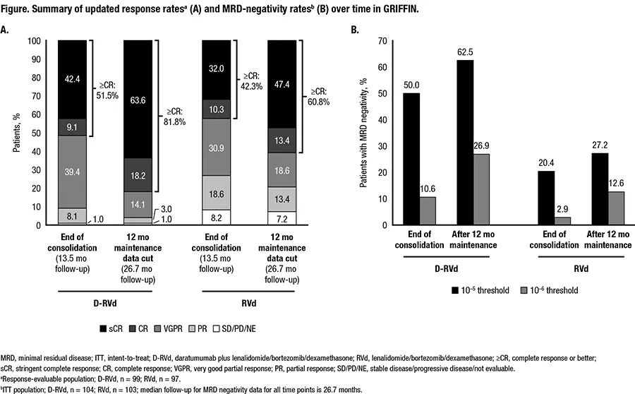 在适合移植的NDMM患者的II期GRIFFIN研究(NCT02874742)的主要分析中,与RVd相比,Dara + RVd(D-RVd)四药组合方案显著改善了移植后巩固治疗结束时的严格完全缓解(sCR)率。在RVd诱导和巩固治疗的基础上加用CD38单抗,随后进行D-R维持治疗,维持治疗12个月后数据更新提示,维持治疗过程中缓解深度持续加深,sCR和MRD阴性率更高。与巩固治疗后的sCR率和MRD阴性率相比,维持治疗增加了sCR率和MRD阴性率。更重要的是长时间随访的过程中未观察到新的安全性问题,说明在初治适合移植的骨髓瘤患者中,含有CD38单抗的四药D-RVd诱导及DR的维持仍可让更多患者获益。