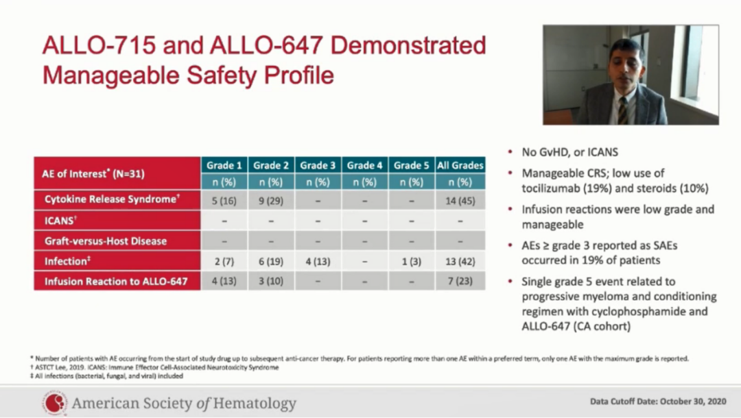 这些早期数据提示ALLO-715和ALLO-647有着可控的安全性。ALLO-715在复发难治性多发性骨髓瘤患者(R/RMM)的同种异体治疗表现出一定的临床有效性,并且临床效果与细胞剂量呈正相关。