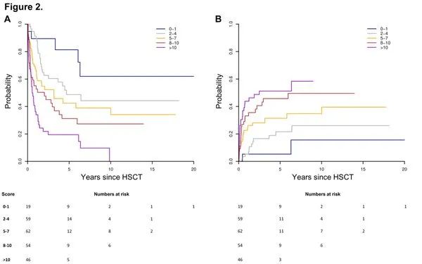 分析显示,CMML-移植者预后评分(范围0-20)可预测患者生存情况和非复发死亡率(P <0.001,P <0.001),并将患者分为5个风险组,患者5年生存率分别为:0-1分者81%,2-4分者49%,5-7分者43%,8-10分者31%,> 10分者19%,见图1。