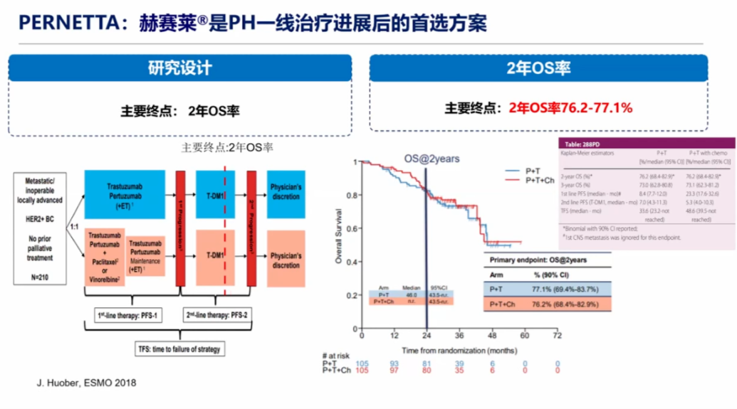 当前,PH双靶方案已成为HER2阳性乳腺癌患者的一线标准治疗,对于应用PH双靶一线治疗后出现进展的患者,PERNETTA研究结果显示,PH+ET或PH+化疗发生进展后二线应用T-DM1的患者两年OS率并没有显著差别(77.1% vs.77.6%),但两组患者PFS均显著延长。证明了对于PH双靶后出现进展的患者,采用T-DM1治疗可能是很好的选择。