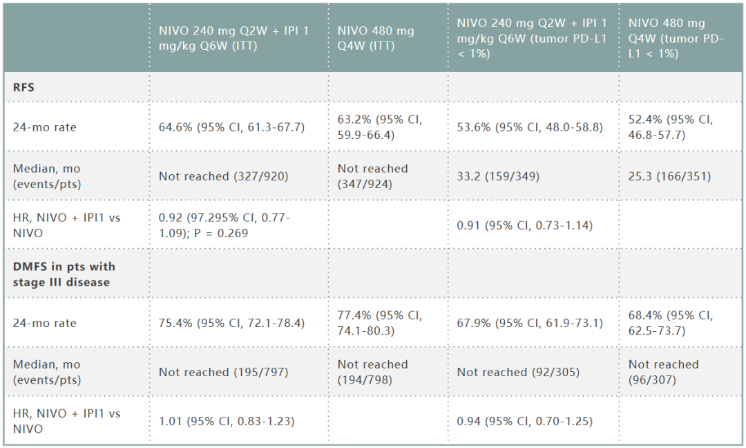 研究结论:与NIVO相比,NIVO+IPI方案在ⅢB-D/Ⅳ期已切除黑色素瘤辅助治疗中没有带来显著的RFS或DMFS改善;安全性与既往研究报道一致。