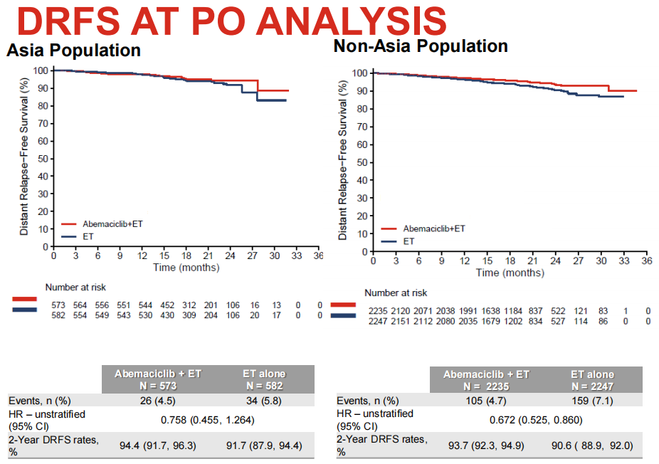 经过19个月的中位随访后(亚洲人群:阿贝西利联合内分泌治疗组为19.0个月,单纯内分泌治疗组为18.8个月,22.7%[n=262]患者完成了2年的治疗,非亚洲人群:阿贝西利联合内分泌治疗组为19.1个月,单纯内分泌治疗组为19.3个月。26.2%[n=1175]患者完成了2年的治疗),在亚洲人群中共观察到75例iDFS事件(阿贝西利联合内分泌治疗组为33个,单纯内分泌组为42个),与单纯内分泌治疗相比,阿贝西利联合内分泌治疗在数值上显示可以改善iDFS,可降低22.3%的浸润性疾病进展风险(HR=0.777,95% CI:0.493~1.227)。阿贝西利联合辅助内分泌治疗组和单纯内分泌治疗组2年iDFS率分别为93.2%和90.1%,2年iDFS率绝对获益3.1%。