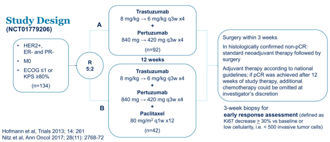 方法:前瞻性多中心WSG-ADAPT-HR-/HER2+Ⅱ期试验是ADAPT伞型系列研究的一部分。cT1-cT4c,cN0-3期的HR-/HER2+EBC患者(n=134)随机分入妥妥双靶联合/不联合紫杉醇周方案化疗组。所有肿瘤均为HR-(ER和PR<1%),HER2+(中心实验室确认FISH 2+阳性或免疫组化显示3+)。主要终点为pCR(ypT0/is/ypN0);在pCR的患者中允许省略后续化疗。试验目的是比较P+T+paclitaxel(Pac)组的pCR与P+T组的早期应答(定义为3周后细胞数量低和/或Ki67下降>30%)。由于在P+T+Pac组中观察到pCR优势,试验提前终止。次要终点包括安全性、5年(远处)DFS、OS和转化研究。研究采用Cox回归分析。使用乳腺癌360面板评估PAM50亚型。