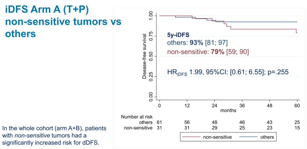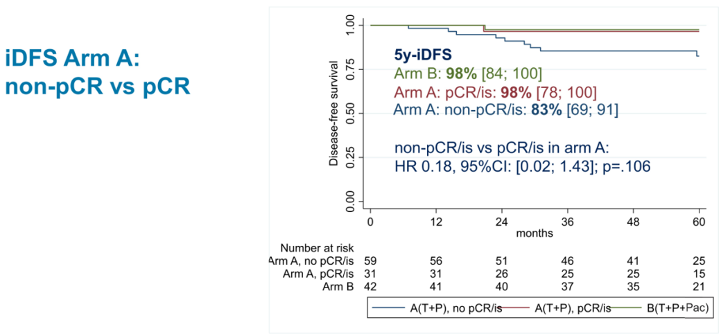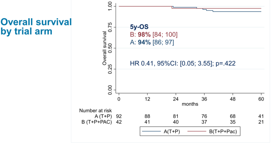结果:134例患者随机分为P+T组(n=92)和P+T+Pac组(n=42)。60%的肿瘤为cT2-4期,临床淋巴结阳性率为42%。中位随访5年后,各研究组间在DFS、DDFS和OS方面无显著差异;在整个ITT人群中仅观察到13例iDFS事件(7例DDFS)。12周治疗后的pCR(与非pCR相比)与iDFS的改善密切相关(与研究组无关)(5y iDFS 98% Vs 87%,HR=0.32,95%CI:0.07~1.47;P=0.144)。