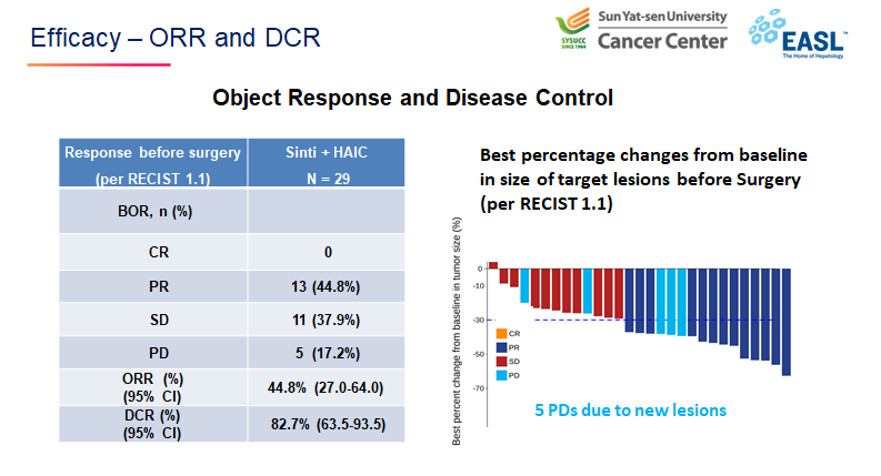 研究入组30例初诊肝癌患者,治疗前经穿刺病理证实为HCC,主要入组标准包括:肿瘤局限于半肝,伴门静脉癌栓(Vp1-Vp3)和/或肝静脉侵犯,无肝外转移,KPS评分≥90,Child-Pugh A级。主要研究终点为按RECIST 1.1评估的无进展生存期(PFS,定义为首次治疗至疾病进展或术后复发或死亡的时间,以先发生者为准)。次要终点包括客观缓解率(ORR)、疾病控制率(DCR)、手术转化率、总生存(OS)、安全性等。患者接受信迪利单抗 200mg IV D1 + FOLFOX-HAIC D2-3 Q3W治疗,每2周期评估,如果达到PR或SD伴肿瘤明显缩小,MDT评估后实施转化手术,术后接受信迪利单抗单药200mg IV Q3W辅助治疗直至复发或不可耐受毒性,信迪利单抗最多用药16次。未成功转化手术的患者,则继续接受FOLFOX-HAIC及信迪利单抗的联合治疗(最多8个疗程),直至疾病进展或不可耐受毒性。患者出现影像学证实的疾病进展前不接受方案以外的其他抗癌治疗,所有患者随访至死亡。