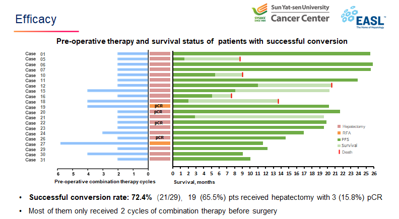 除1例患者自行退出研究外,29例患者接受了疗效评价。截至2021年5月,中位随访时间17.8个月,全组患者中位PFS 15.7个月,12个月PFS率57.9%。亚组分析显示是否进行转化手术对预后有显著影响,未手术和手术患者的中位PFS分别是5.49个月和未达到(P=0.009),手术患者的中位PFS估计可达到24个月以上(图2)。术前ORR为44.8%,DCR 82.7%(图3)。21例成功转化的患者大多在术前仅接受了2周期的联合治疗,成功转化率达72.4%(21/29),其中19例(65.5%)患者接受肝切除术,有3例(15.8%)术后病理完全缓解(pCR),另外2例患者接受射频消融(RFA)治疗(图4)。