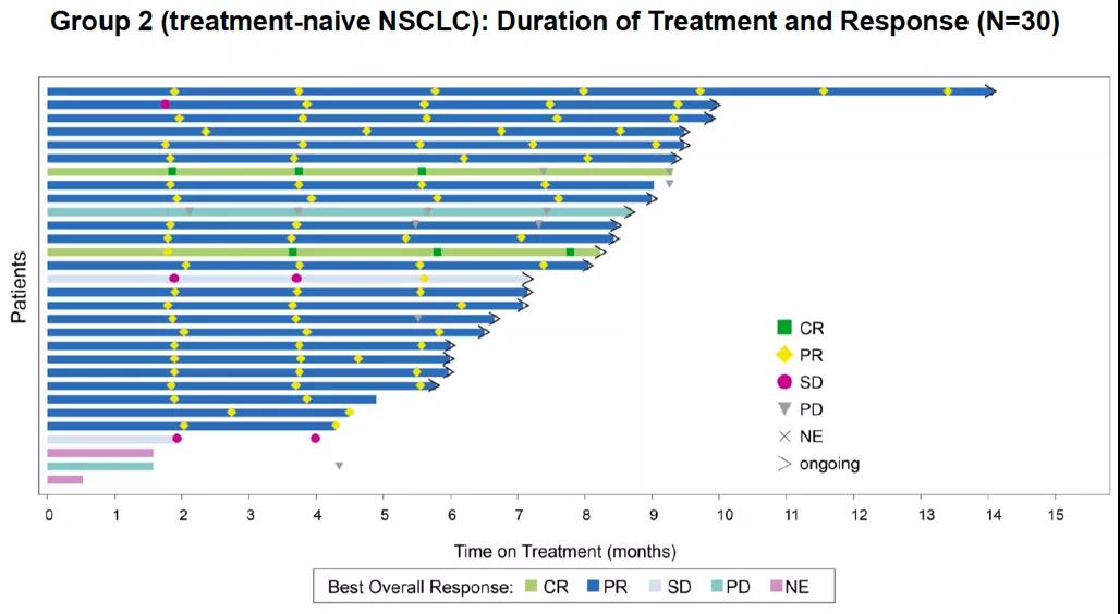 对既往接受过化疗的患者,中位随访17.0个月后, ORR为 66.7%。3%的患者获得CR,63.6%达PR。中位起效时间为1.89个月。6个月和9个月DOR率分别为77.3%和50.0% 。中位治疗持续时间为14.65个月。在既往未接受治疗的患者中,中位随访时间8.2个月,ORR达80%,其中6.7%获得CR,73.3% 为PR。中位起效时间为1.87个月。6个月和9个月DOR率分别为76.7%和38.3%。中位治疗持续时间为7.13个月。两类患者中分别有68.18% 和79.17% 的应答者继续接受治疗。Pralsetinib在中国人群中同样显示出安全性可控,具有良好的耐受性。98.5%的患者有TRAEs,10.3%因TRAE停药,发生率≥5%的≥3级TRAE包括淋巴细胞计数减少 (5.9%)、白细胞减少 (5.9%) 和低磷酸盐血症 (11.8%)。(见图7)