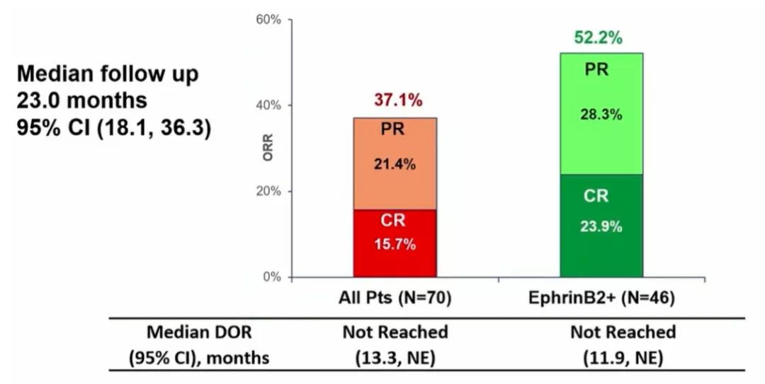 中位随访25.4个月(范围1.3-48.3),所有受试者的中位OS为14.4个月(95%CI:6.4~21.4),ORR为38%,中位PFS为4.0个月(95%CI:2.3~5.5),中位DOR为8.0个月。在62例可评估患者中,ORR为37.1%,其中有40例患者表达B2(65%)。B2阳性患者的ORR为52.2%,中位OS为15.3个月(95%CI:12.0~NE),中位PFS为6.5个月(95%CI:26~12.8),中位DOR为27个月(范围10.4-NE)。中位治疗周期为5(范围1-36)。6例患者仍在治疗,5例患者停止治疗且无PD。