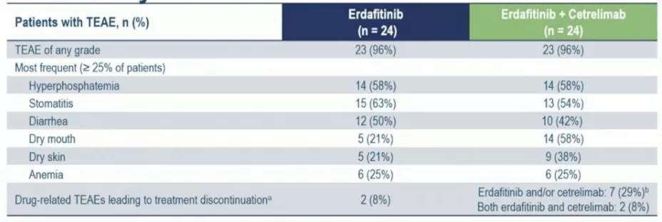 截至2021年7月19日,共有53名患者被随机分组;ERDA组26例,ERDA+CET组27例。ERDA组和ERDA+CET组的中位年龄分别为75岁和69岁;内脏转移比例分别为54%和52%;ECOG为0-1的比例分别为77%和63%。可评估患者的疗效数据如表所示。安全分析人群包括24名接受ERDA的患者和24名接受ERDA+CET的患者。最常见的治疗紧急不良事件是高磷血症(ERDA vs ERDA+CET,58%vs 58%)、口腔炎(63% vs 54%)和腹泻(50% vs 42%)。