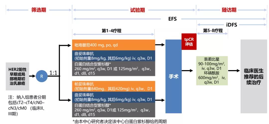 该研究将入组HER2阳性的早期或局部晚期乳腺癌患者,分期为cT2-T4/cN0-N3/cM0。符合条件的患者将1∶1随机至吡咯替尼组或帕妥珠单抗组。分层因素包括激素受体状态和原发肿瘤大小。患者将接受4个周期的新辅助治疗,吡咯替尼或帕妥珠单抗联合曲妥珠单抗和白蛋白紫杉醇,随后进行手术和后续4周期化疗。tpCR将在手术后进行评估,后续的辅助治疗将由研究者决定。