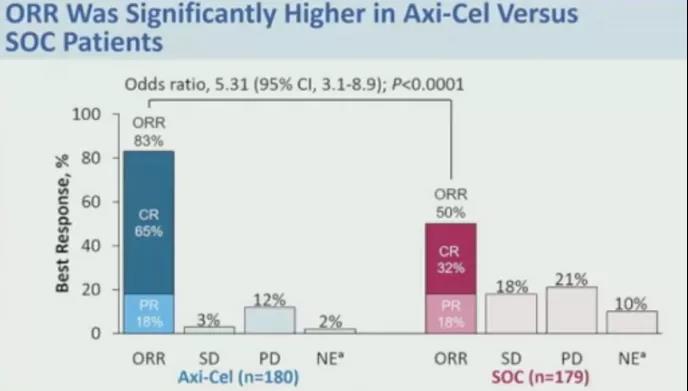 中位随访24.9个月,结果显示:①axi-cel组的客观缓解率(ORR)显著高于SOC组,分别为83% vs 50%(OR=5.31,95% CI: 3.1–8.9; P<.0001),完全缓解率(CR)则分别为65% vs 32%, 见图1。