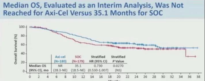 ③在总体生存(OS)方面,axi-cel组患者的中位OS尚未达到(NR), SOC组中位OS为35.1个月(HR: 0.730; P=.027), axi-cel组更佳, 详见图3。