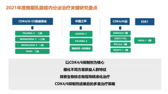 报告伊始,郝春芳教授首先对2021年度晚期乳腺癌内分泌治疗关键性研究进行了盘点:一线治疗和二线治疗中CDK4/6抑制剂相关研究先后报道了OS数据,在中国人群中开展的相关研究也先后达到主要终点,同时也有多项研究聚焦于CDK4/6抑制剂治疗进展后的人群治疗中。最后,其用“以CDK4/6抑制剂为核心,细化不同方案获益人群特征、探索生物标志物指导精准化治疗、CDK4/6抑制剂进展后的多重治疗策略”对2021年各项研究进展进行了概括。