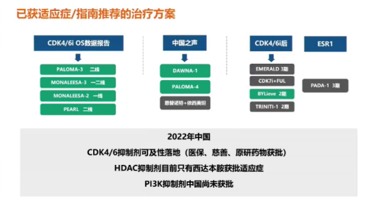 随后,郝春芳教授又对已经获得适应证/指南推荐的治疗方案进行了部分总结,她指出,2022年中国“CDK4/6抑制剂可及性落地(医保、慈善、原研药物获批),HDAC抑制剂目前只有西达本胺获批适应证,PI3K抑制剂中国尚未获批”。