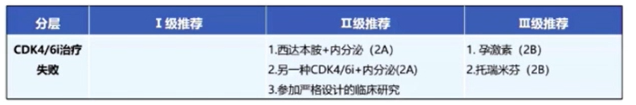 随着CDK4/6抑制剂在中国人群的广泛应用,这一问题也变得尤为实际,但当前对于CDK4/6抑制剂治疗失败人群的Ⅰ级推荐指南中并没有给出相应治疗方案;在Ⅱ级推荐中,西达本胺+内分泌和另一种CDK4/6抑制剂+内分泌治疗均被作为2A级证据,参加严格设计的临床研究也是Ⅱ级推荐的一种方案;在Ⅲ级推荐中,孕激素和托瑞米芬均被做为2B级证据进行推荐。