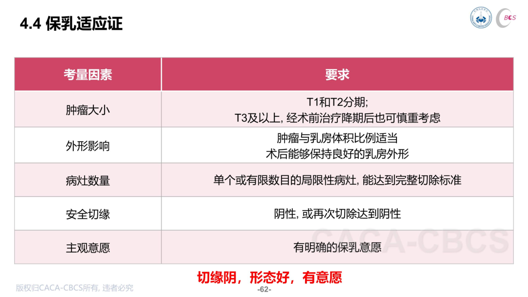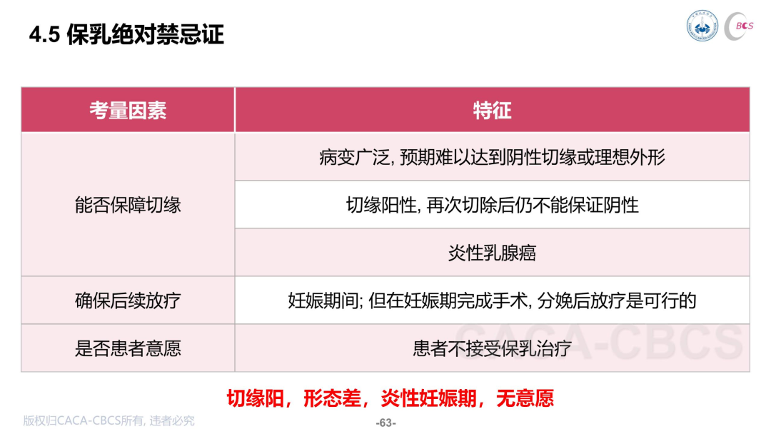 CBCS指南从能否保障切缘、确保后续放疗等三方面指出保乳手术的绝对禁忌症:(1)病变广泛,预期难以达到阴性切缘或理想外形;(2)切缘阳性,再次切除仍不能保证切缘阴性;(3)炎性乳腺癌;(4)妊娠期间需要接受放疗;(5)患者不接受保乳治疗。齐晓伟教授总结为“切缘阳、形态差、炎性、妊娠期、无意愿”。