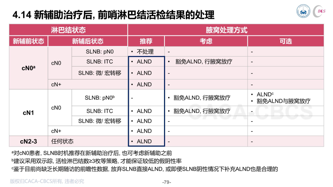 指南对新辅助后前哨活检的推荐仍较为谨慎,因为目前ACOSOG Z1071、FN SNAC、SENTINA等国际研究得出的SLN假阴性率差异较大。因此,除了cN0新辅助治疗后前哨活检仍为pN0或ITC的患者,指南推荐可以无需后续处理,其他情况下新辅助后的不同前哨活检情况下,仍建议进行腋窝淋巴结清扫。