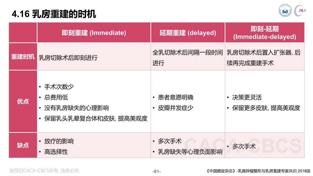 关于重建时机的问题,CBCS指南总结了即刻重建、延期重建、即刻-延期重建的优缺点如下,临床医生和患者应根据个体情况进行选择。由于目前国内重建以假体植入为主,大部分患者可以采取即刻重建,少数容积不足的患者可以放置扩张器后再完成重建。此外,自体重建、植入物重建也存在各自的优缺点。自体重建可耐受术后放疗、感染风险低,柔软、自然、下垂感更好,但手术复杂且有供区瘢痕及相关并发症;植入物重建创伤小、瘢痕小、康复时间段,但对放疗有不利影响,且触感和美观有所欠缺、价格昂贵。