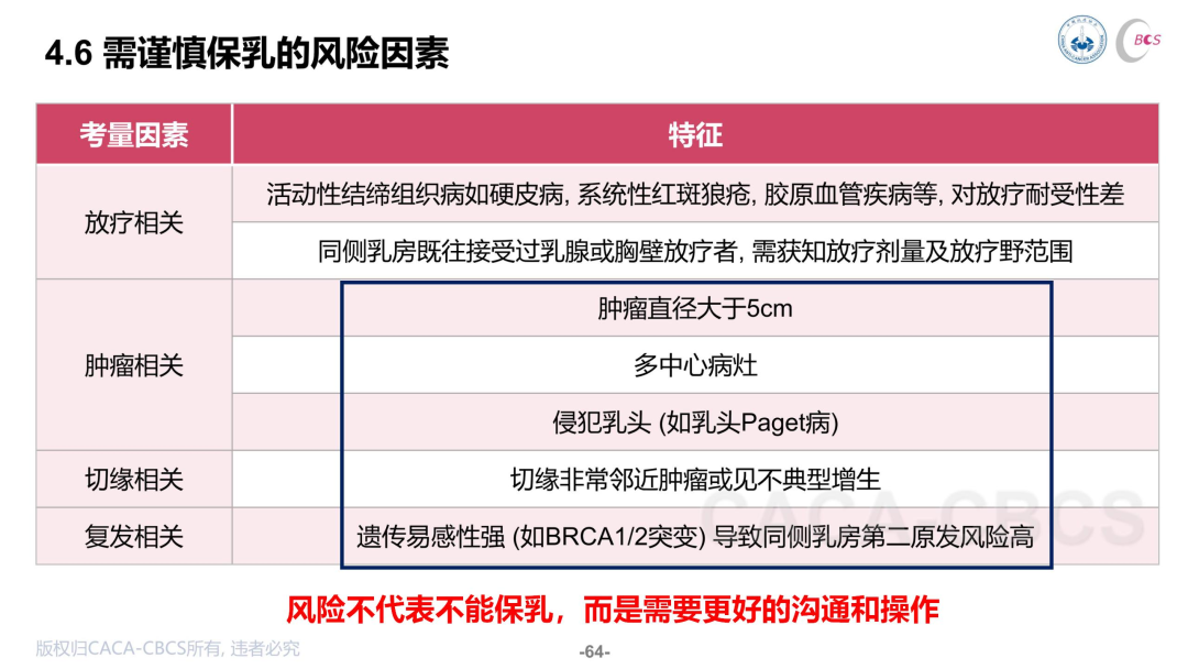 此外,指南还指出了谨慎保乳的风险因素,包括(1)放疗相关因素,比如对放疗耐受性差的、既往接受过同侧乳腺或胸壁放疗的患者;(2)肿瘤相关因素,比如肿瘤>5cm、多中心病灶、侵犯乳头;(3)切缘相关,比如切缘非常邻近肿瘤或有不典型增生;(4)复发相关,比如遗传易感性强导致同侧第二原发风险高。齐教授指出,风险并不代表不能保乳,而是需要更好的沟通和操作。