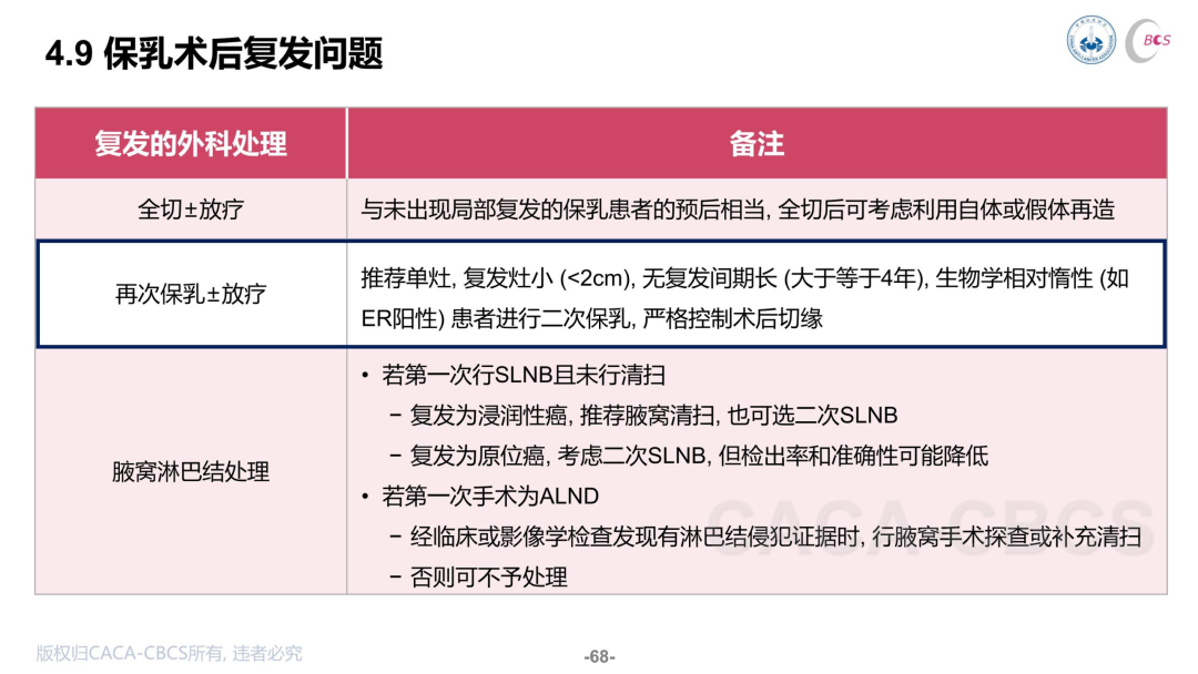 对于保乳复发患者,通常给予全切±放疗,经过严格选择的少数情况可以考虑再次保乳±放疗:比如单复发病灶、复发灶较小(<2cm)、无复发间期较长(≥4年)、生物学相对惰性(如ER阳性),但需严格控制术后切缘。此外,第一次手术时行SLNB且未清扫的保乳复发患者,复发为浸润性癌者可以选择腋清或二次SLNB,复发为原位癌可行二次SLNB,但检出率和准确性可能降低;如果第一次行腋清而发生保乳复发,无临床或影像检查发现侵犯淋巴结的患者可行腋窝探查或补充清扫,否则不予处理。