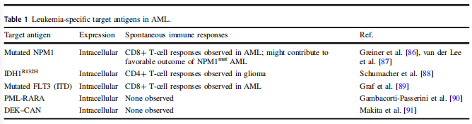 白血病特异性抗原,在理想情况下一般来源于突变,通常表达于细胞内,其HLA分子的背景下呈现如下表。由于这些抗原是来源于白血病突变编码的异常蛋白,在恶性克隆中常常为互斥性表达,因此可能是“理想的”靶点。然而,值得指出的是,并非所有这些细胞内抗原都出现于细胞表面。新的白血病特异性抗原迄今尚未在AML临床试验中进行评估。